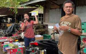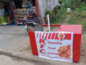 Life in the Philippines: A couple has a store on wheels. They often park in front of this busy drug store. Their son plays on his phone while they do business.