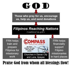 We are Filipinos Reaching Nations. If you are somewhere in this chart, Gina and I really appreciate you! Marty, for example, has done so much work managing our affairs in the USA for almost 12 years. Sherrie and others provide care for us when we visit the USA. Some write encouraging messages that bless us more than you can know. Generous donors, wise advisors, prayer warriors…